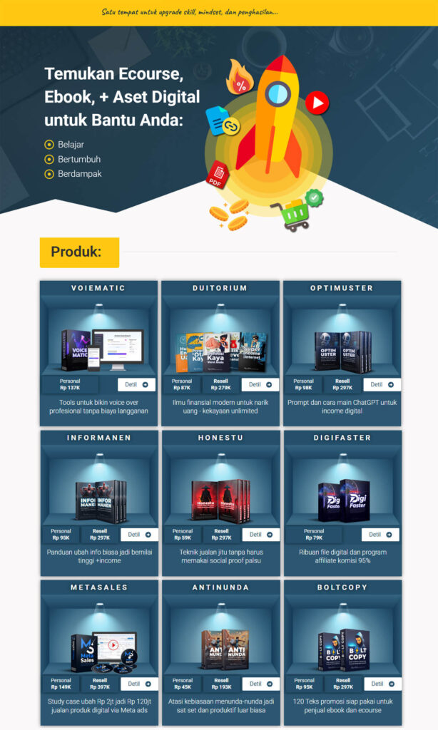 Di Afilatom, web yang didapat sudah berisi 33 produk digital yang real dijual (bukan dummy product). Anda bisa langsung fokus promosi dan menghasilkan penjualan.